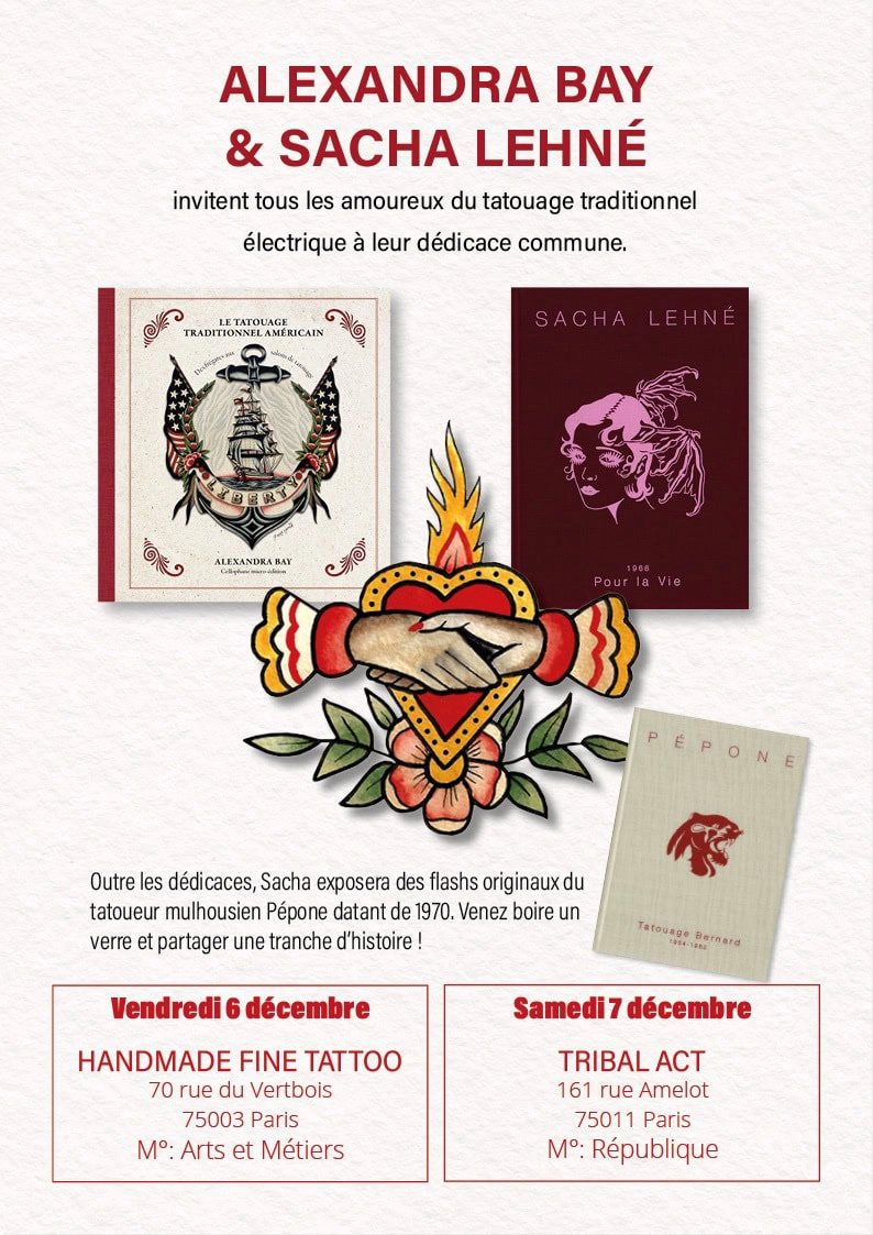 Avec Sacha Lehne, nous avions envie de partager avec vous notre amour du tatouage traditionnel électrique le temps d’une dédicace. Pour ma part, ce sera avec Le tatouage traditionnel Américain et pour Sacha, avec son nouveau livre joliment intitulé « Pour la vie ».