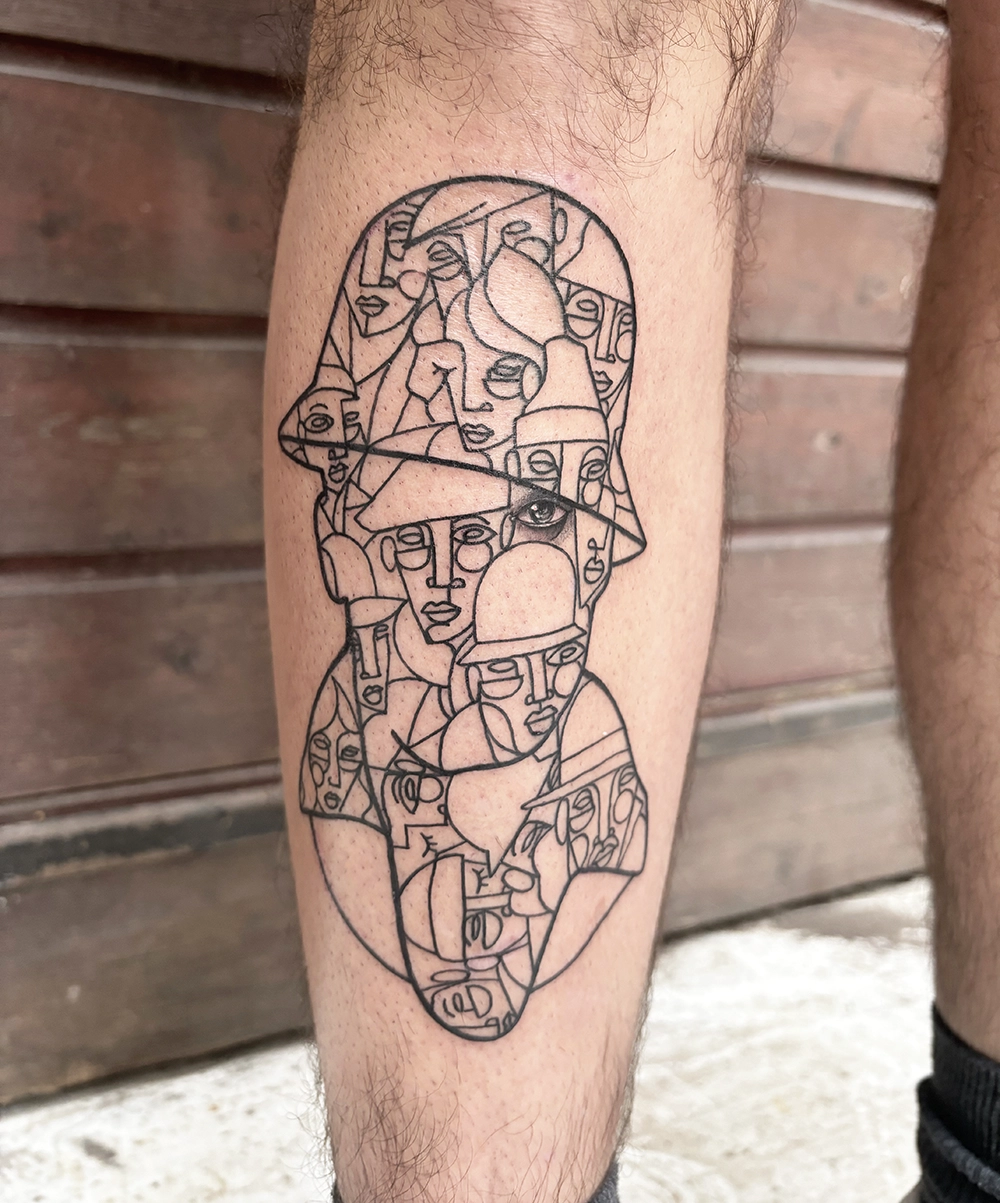 Avec ses influences, le tatoueur reprend le concept et le recrache en mode cubiste : « À l’époque je faisais beaucoup de one line, mais quand tu le fais au spray ça a du sens, car tu n’as pas à lever la main. Avec le dermographe, je ne retrouvais pas le même plaisir à le faire. Un jour, j’étais au boulot, au téléphone, je gribouillais l’un de mes dessins machinalement. J’ai dessiné dans un style plus géométrique.